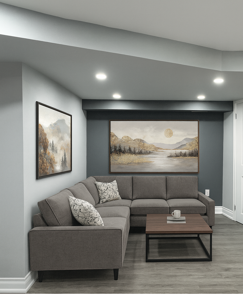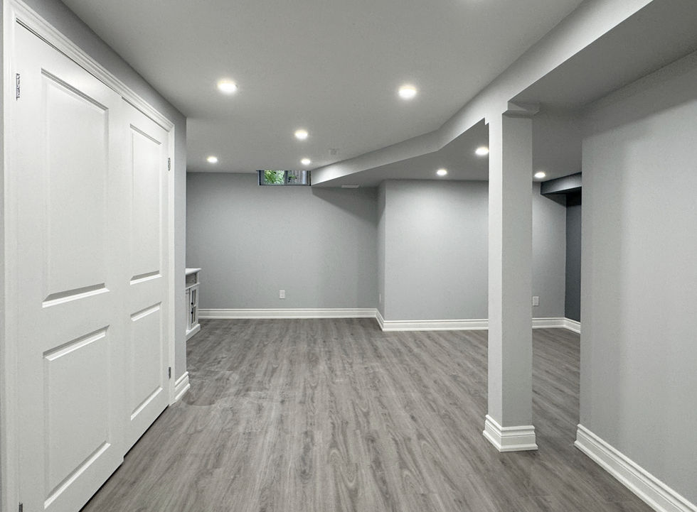 This basement renovation was a complete refresh from the inside out. We removed all existing drywall to properly locate and fix the leak, then rebuilt the space with clean finishes to make it feel like new again. After the repairs, we upgraded the basement with new flooring, fresh paint throughout, and modern pot lights, instantly making the space brighter, cleaner, and more welcoming.