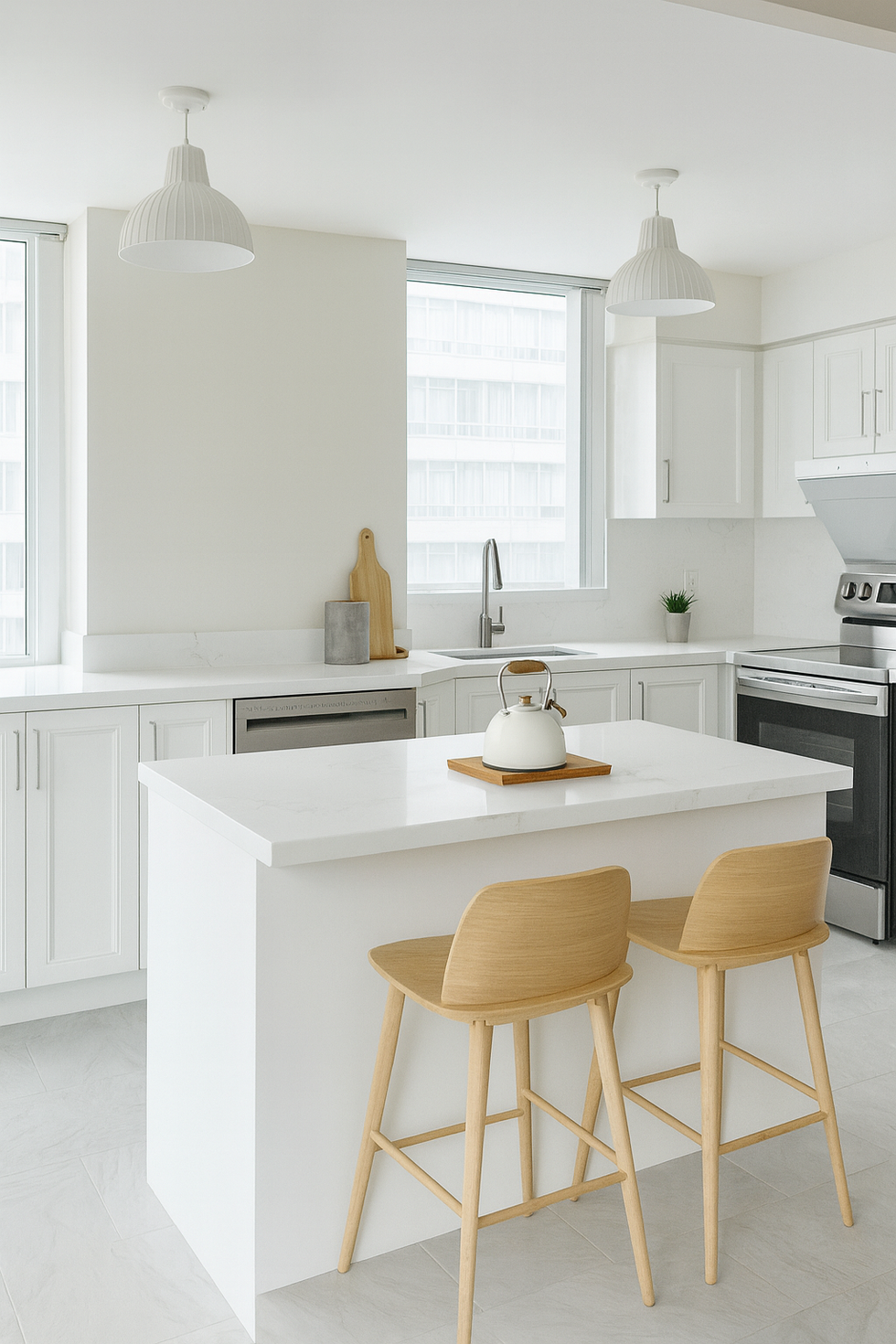 The new layout also gave us room to add a central island with seating, positioned to face the windows, so you can enjoy the city view while having your morning coffee or meals. We designed a circular pathway around the island, creating a much smoother circulation route than before and making the space feel effortless to move through. Finished with crisp white cabinetry and clean, modern lines, the result is a light, functional, and welcoming condo kitchen built for daily living and entertaining.
